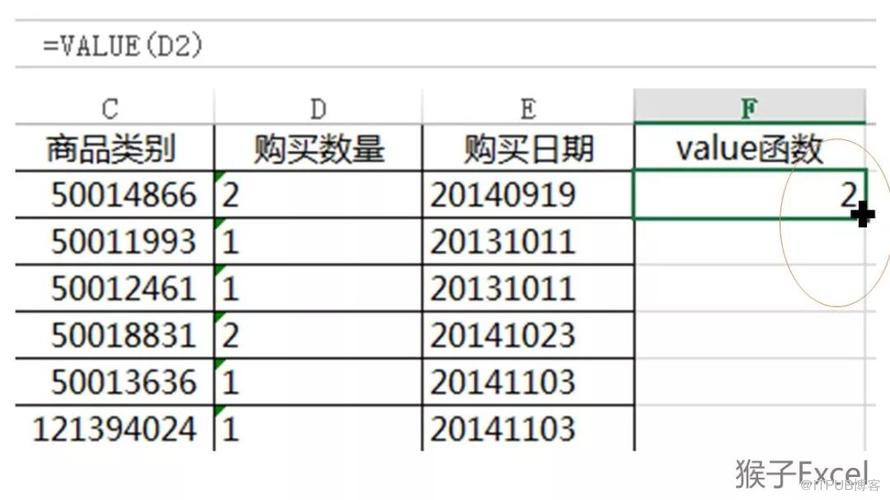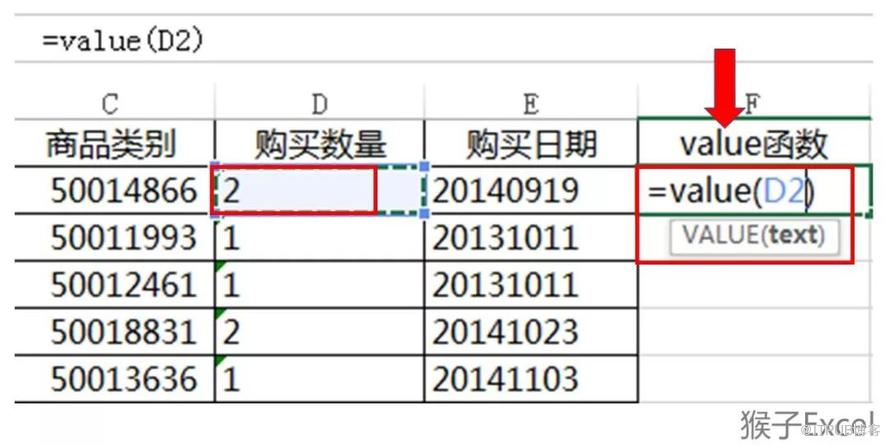 新建一列作为辅助列,用于存放转换后的数值。在这个案例数据上,我新建的列是F列。在这一列的F2单元格里输入下图中的value函数:=value(D2),表示让这一单元格的值等于D2单元格的值。