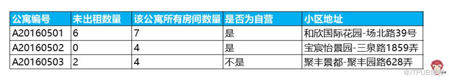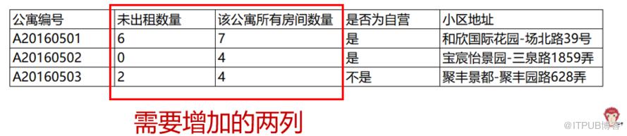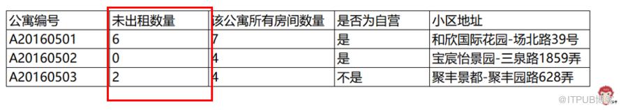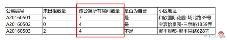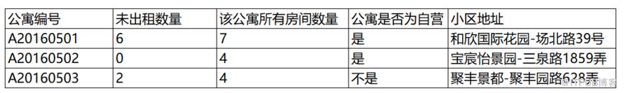 题目要求报表的格式,其中公寓编号、是否为自营、小区地址为现有表中的字段,需要添加的字段是未出租数量、该公寓所有房间数量。