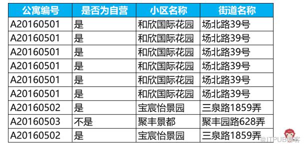 公寓表:包含公寓id,公寓编号,该公寓是否为自营,对应的小区id