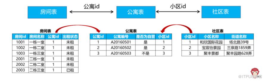 观察得知,通过“公寓id”可将房间表和公寓表联结;通过“社区id”可将公寓表和社区表联结。