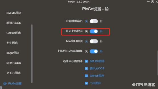 修改PicGo 设置开启上传提示,这样上传成功后会后提示。