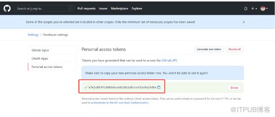 完成上面步骤后,会生成一串token,这串token之后不会再显示,所以第一次看到的时候,可以建个文本文件好好保存,忘记了只有重新生成,每次都不一样。