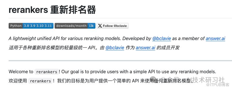 完整的源代码和支持模型列表会定期更新,并在 https://github.com/answerdotai/rerankers 上提供。