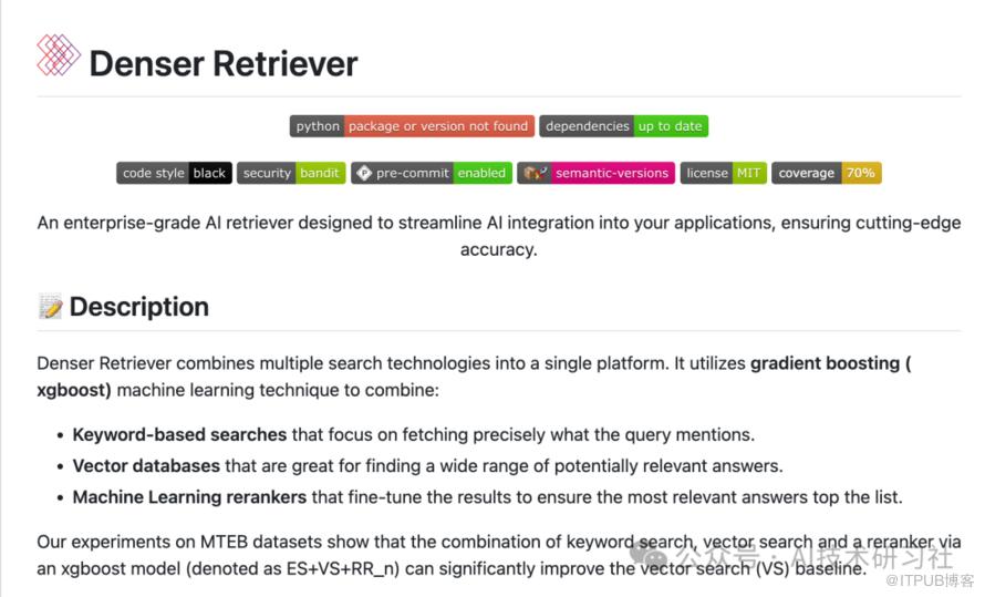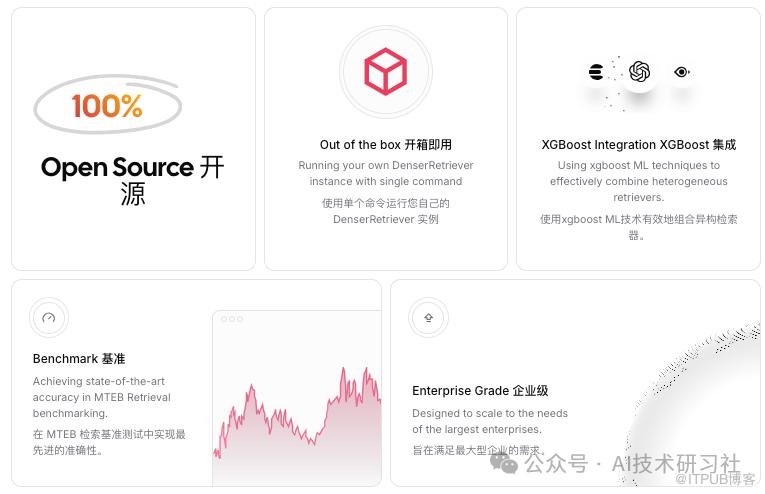 Denser Retriever 完全开源,允许用户轻松构建自己的 RAG 应用和聊天机器人。DenserAI 团队推出的 Denser Retriever 在快速原型设计方面表现卓越。它将关键词搜索、向量搜索和机器学习重排序结合在一个平台中,并通过梯度提升(xgboost)技术优化搜索结果。