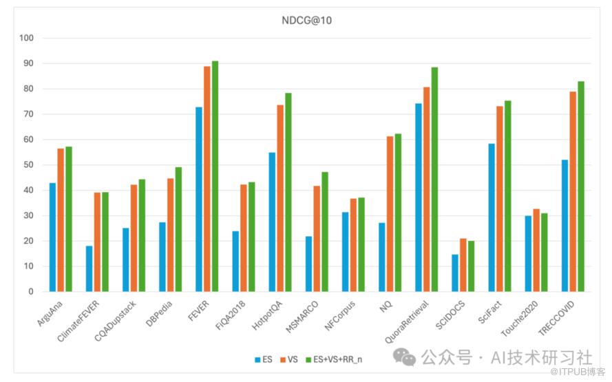 具体而言,ES+VS+RR_n 模型在 15 个 MTEB 数据集上的 NDCG@10 得分达到了 56.47,较 snowflake 模型(NDCG@10 得分为 54.24)有绝对提升 2.23, 相对提升 4.11%。在广泛认可的 MSMARCO 基准数据集上,ES+VS+RR_n 模型将 snowflake 模型的 NDCG@10 得分从 41.77 提升至 47.23,带来了 13.07% 的相对提升。