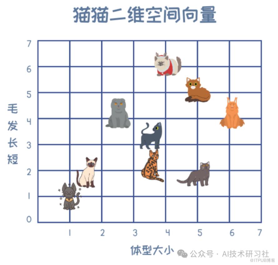 对于人类来说,我们往往能通过一些关键特征来区分物体间的差异。举例来说,对于熟悉猫的人,他们能很快辨别不同种类的猫,因为他们会根据不同的角度来观察猫的特征,比如体型大小。然而,对于大型猫科动物的不同品种,我们可能需要更多的特征来帮助区分,例如毛发的长短。通过这些特征,我们可以将猫映射到一个二维坐标系中,以可视化它们之间的差异。