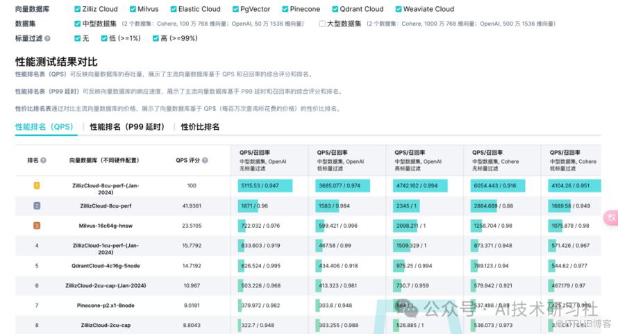 https://zilliz.com.cn/vector-database-benchmark-tool?database=ZillizCloud%2CMilvus%2CElasticCloud%2CPgVector%2CPinecone%2CQdrantCloud%2CWeaviateCloud&dataset=medium&filter=none%2Clow%2Chigh&tab=1