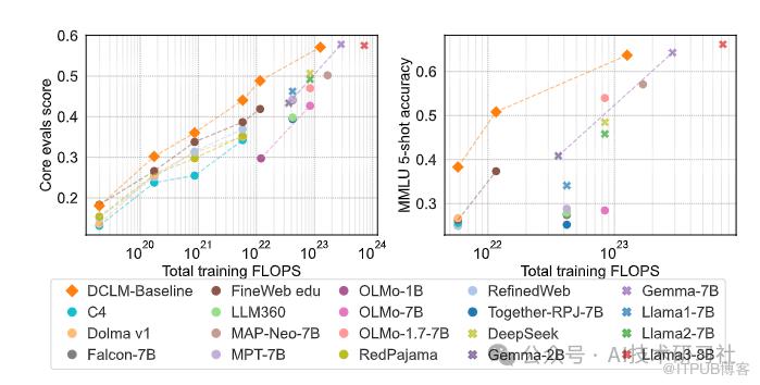 由此产生的数据集 DCLMBASELINE 可以使用 2.6T 训练令牌在 MMLU 上从头开始训练 7B 参数语言模型,达到 64% 的 5 次准确率。与MAP-Neo(以前最先进的开放数据语言模型)相比,DCLM-BASELINE 比 MMLU 提高了 6.6 个百分点,同时训练的计算量减少了 40%。