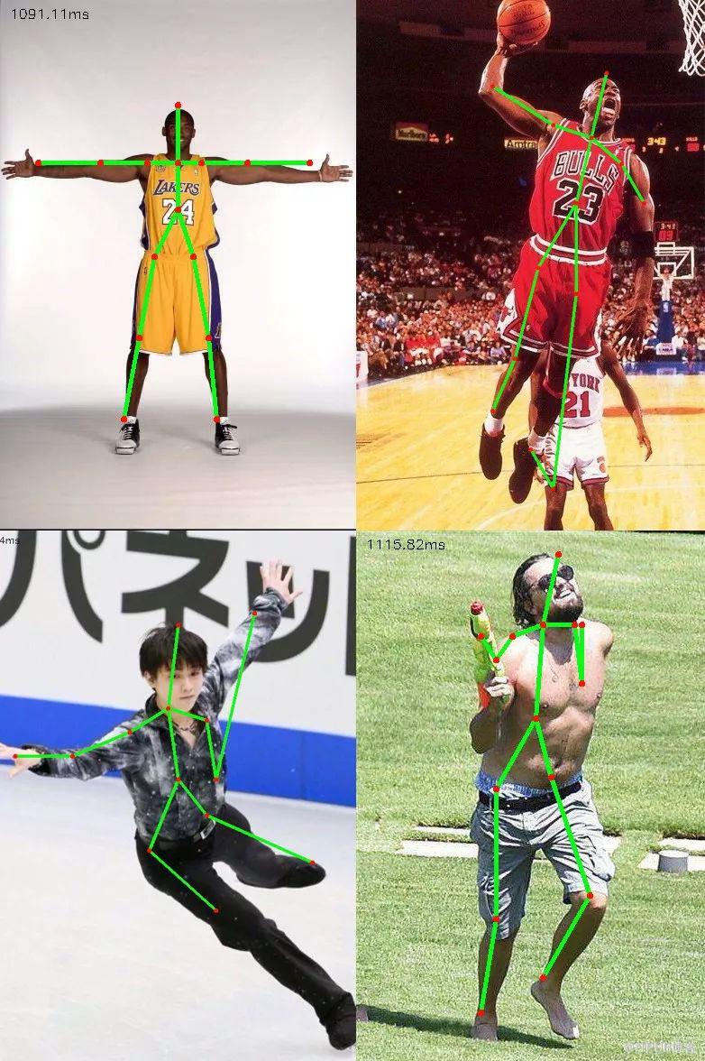 和之前 fast-neural-style 的代码类似,大部分的工作都是 Openpose 做好的,OpenCV 这里只是使用训练好的神经网络进行计算。所以核心代码其实没有几行,而且跟上次的例子几乎一致。剩下一半的代码都是在把获取到的关键点坐标绘制成人体的骨架结构。