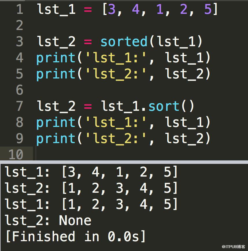 lst.sort() 则是对列表本身进行排序,改变了原有列表数据。但它没有返回值。