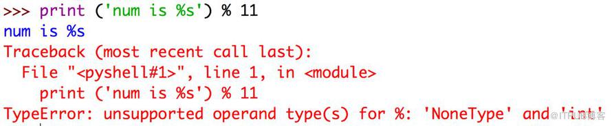 会有人觉得我这里不是加了括号了吗,为什么还不行?这个式子在程序中的执行是:1. 输出 'num is %s',2. 把 print 的返回值做 % 11 操作。但 print 函数没有返回值,也就是 None,所以就报错了。应该用括号把要输出的所有内容外层括起来。