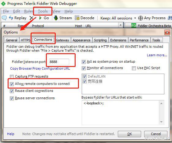 设置允许外部设备发送 HTTP/HTTPS 到 fiddler。设置端口号,并在 Connections 选项栏下勾选 Allow remote computers to connect。