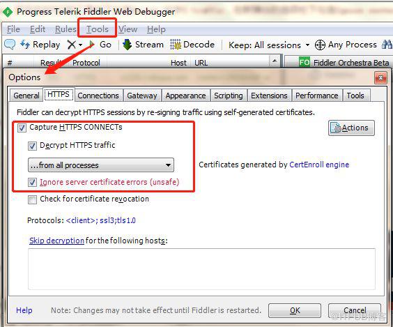 设置允许抓取 HTTPS 信息包。打开下载好的 fiddler,找到 Tools -> Options,然后在 HTTPS 的工具栏下勾选 Decrpt HTTPS traffic,在新弹出的选项栏下勾选 Ignore server certificate errors。这样,fiddler 就会抓取到 HTTPS 的信息包。