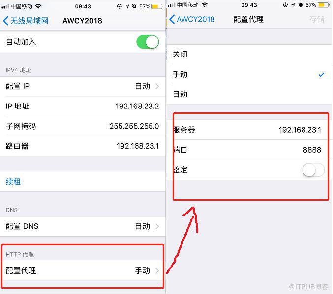 手机设置代理 IP。打开手机无线网络连接,选择已经连接的网络连接,点击一个小圆圈叹号进入可以看到下图(安卓也类似),选择配置代理,进入后把刚刚的 IP 地址输入进去,端口就是 fiddler 中设置的 8888。