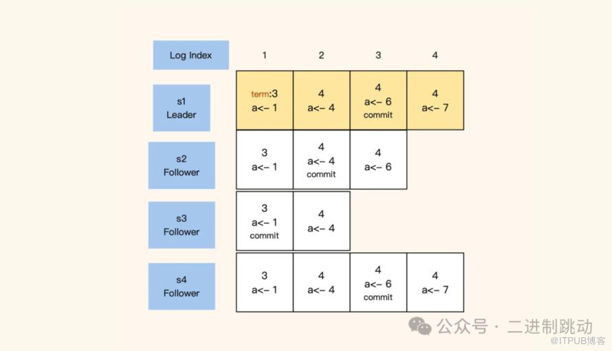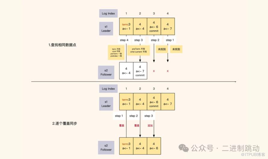 如果以上任意一个方面存在差异,Leader 就会认为 Follower 的日志与自己的日志不一致。在这种情况下,Leader 会逐条倒序对比日志,直到找到日志内容和任期完全一致的索引,然后从这个索引开始按顺序向下覆盖。