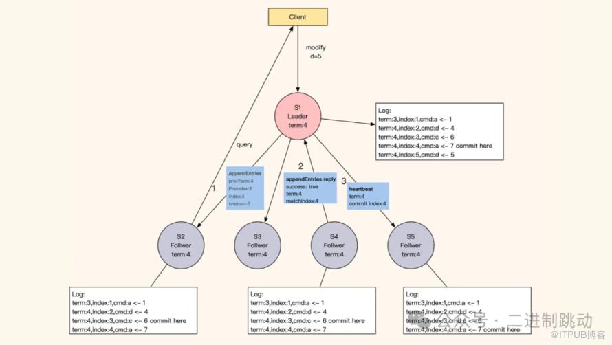 具体来说,当 Leader 成功修改数据后,它会生成一条对应的日志,并将该日志发送给所有 Follower 节点进行同步。只要超过半数的 Follower 返回同步成功的反馈,Leader 就会将该预提交的日志正式提交(commit),并向客户端确认数据修改成功。