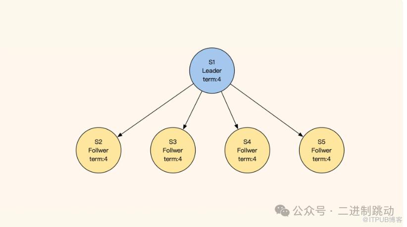 如图所示,我们启动了五个 Raft 分布式数据服务节点:S1、S2、S3、S4 和 S5。每个节点可以处于以下三种状态之一: