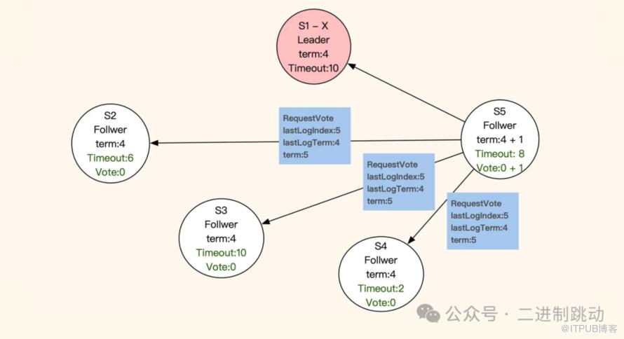那么 Leader 是如何选举出来的呢?在进入选举模式后,这五个节点会各自随机等待一段时间。等待时间一到,当前节点会先为自己投一票,并将其任期(term)加 1(如图中的 term:4 表示第四任 Leader),然后通过发送 RequestVote RPC(即请求投票的远程过程调用)向其他节点拉票。