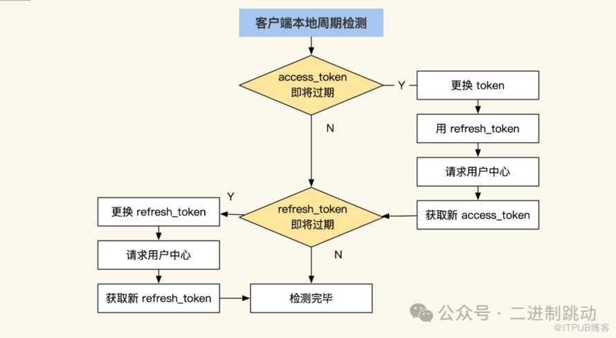 那么如何对 JWT 的 token 进行更换和离线验签呢?具体的服务端换签很简单,只要客户端检测到当前的 token 快过期了,就主动请求用户中心更换 token 接口,重新生成一个离当前还有十五分钟超时的 token。但是期间如果超过十五分钟还没换到,就会导致客户端登录失败。为了减少这类问题,同时保证客户端长时间离线仍能正常工作,行业内普遍使用双 token 方式,具体你可以看看后面的流程图: