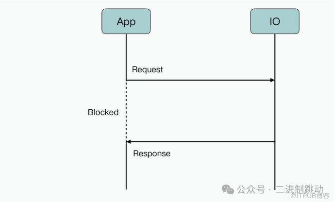 从图中您能够看到,在业务代码发出读写请求之后,当前的线程或进程会被阻塞,只有等到 IO 处理完毕才会被唤醒。