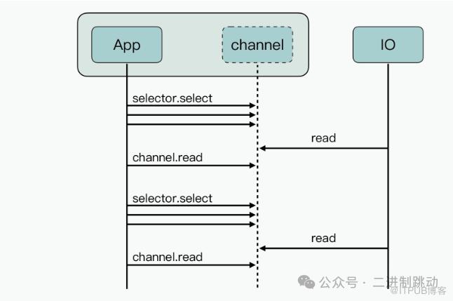 从图中您能看到,当前的业务线程虽然避免了长时间被阻塞挂起,然而在业务线程里,会频繁地调用 selector.select 接口来查询状态。这意味着,在单 IO 通道的场景下,运用这种同步非阻塞交互方式,性能的提升实际上是非常有限的。
