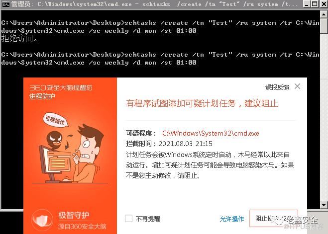 如果主机存在安全软件,计划任务的创建会被阻止,命令行无法成功创建。