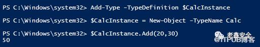 创建了一个名为Calc的类型,它有两个实例方法和一个静态方法,接下来将Calc类型添加到当前的 Powershell 会话,使用 New-Object 创建Calc 类型的实例,然后调用它的方法