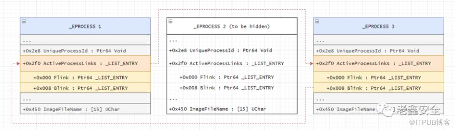 EPROCESS 1中的ActiveProcessLinks.Flink将指向EPROCESS 3的ActiveProcessLinks.Flink