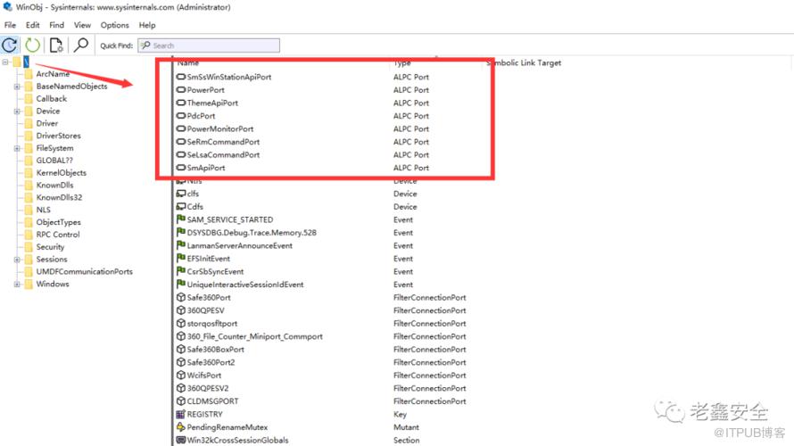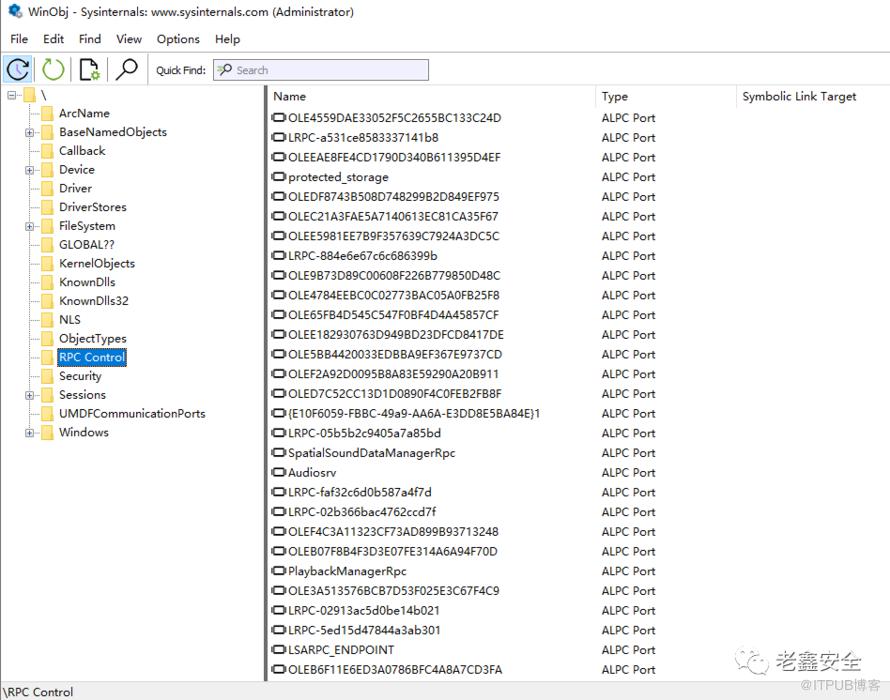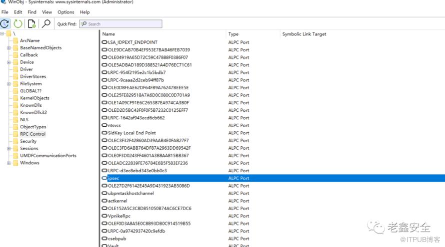 识别ALPC端口对象的最直接的方法,那就是启动WinObj并通过“类型”列找到ALPC对象。