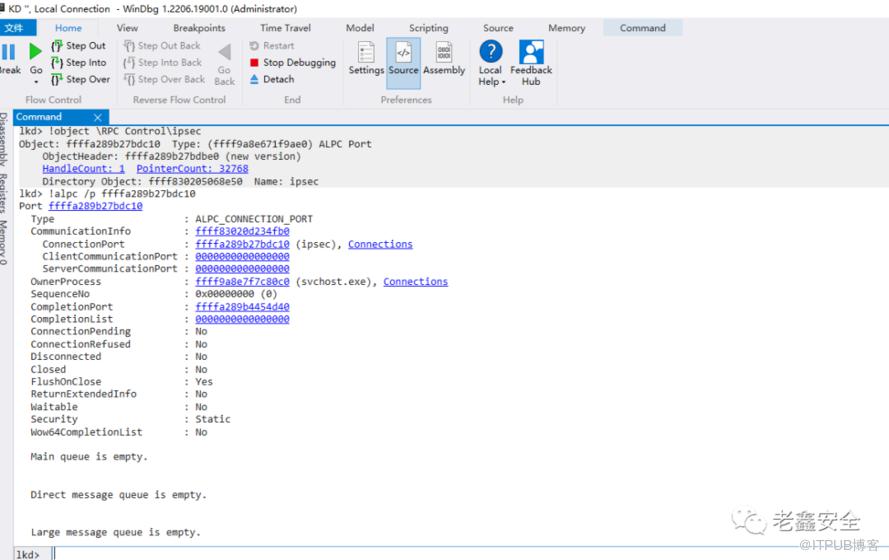说到服务器进程:如上所示,你可以使用WinDbg没有记录的!alpc命令来显示我们刚刚标识的alpc端口的信息。输出包括非常多的有用信息,例如端口的所属服务器进程,在本例中为svchost.exe。
