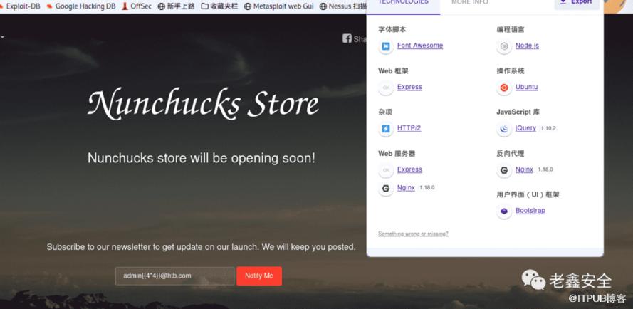 https://nunchucks.htb/ [200 OK] Bootstrap, Cookies[_csrf], Country[RESERVED][ZZ], Email[support@nunchucks.htb], HTML5, HTTPServer[Ubuntu Linux][nginx/1.18.0 (Ubuntu)], IP[10.10.11.122], JQuery, Script, Title[Nunchucks - Landing Page], X-Powered-By[Express], nginx[1.18.0]