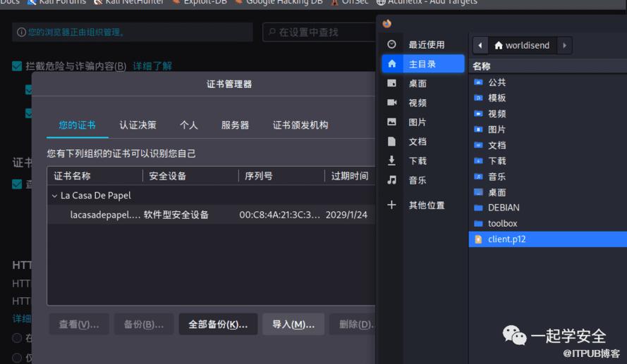 现在我可以尝试用获取到的密钥生成证书并导入浏览器中再尝试访问目标443端口,client.key便是我FTP中收集到的私钥,而client.cer便是Nmap帮我扫描到的服务端证书公钥: