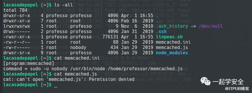 我的想法很清晰,可以收集对应CVE漏洞EXP进行提权,我也可以上传Metasploit载荷获取Meterpreter自动检测提权,但我并不想这么做,机器是以前出现的,脚本是不断更新的,漏洞也是不断披露的,枚举到新的CVE也是意料之中,而且作者也一定不希望我这么做,我还未对目标进行实质性的探索。我将目光放至我忽略掉的当前目录的两个文件memcached.ini和memcached.js。其中memcached.ini是root授予nobody以root权限执行memcached.js。