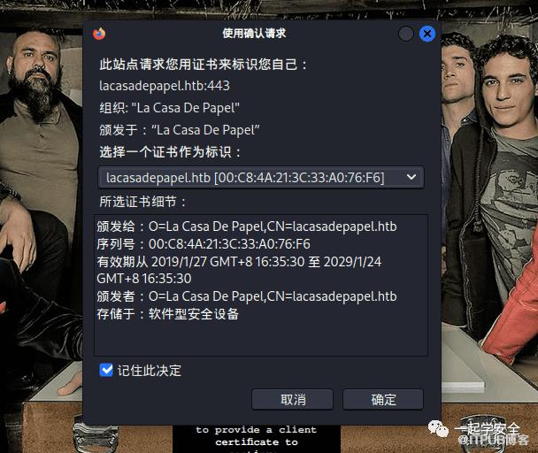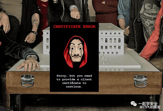 而我忽略了一点,HackTheBox的机器都包含有一个共同的特征机器名+htb便是该机器的Web站点域名 。而Nmap已事先为我探测到了机器的域名为lacasadepapel.htb后知后觉的我简直无法原谅我的愚蠢。于是我添加域名到本地/etc/hosts文件后再次尝试访问https端口,它回应了我一些信息,要求我提供一个客户端的SSL证书: