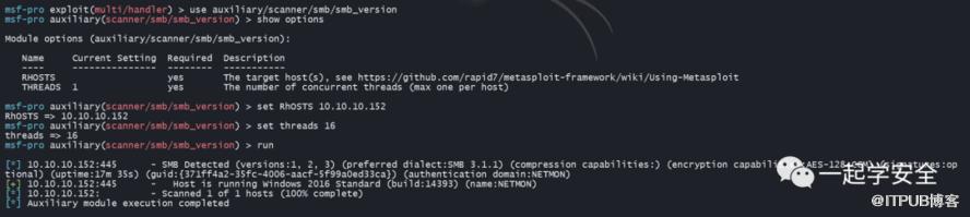然后看一下smb 445端口有没有什么东西。Nmap没确定smb版本,拿Metasploit扫一下,有些意外小收获一个用户名:NETMON