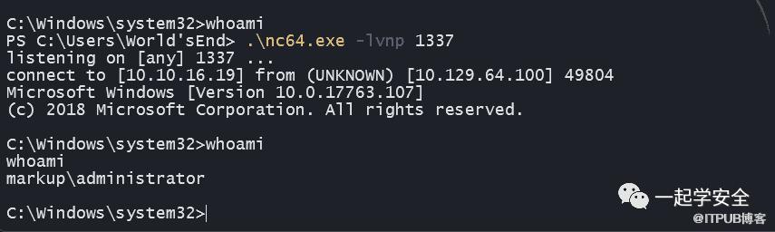 细看一下是清理日志的东西,但是需要管理员身份去调用,查看计划任务发现也是跟这个文件无关的信息,主要计划任务查看也受权限限制无法查看管理员权限的计划任务,PS查看进程也没有wevtil程序运行的相关信息。靠第六感感觉这文件名字像是个计划任务,而我们对其又有写入权限,试试嘛,可以传入个msf木马让其运行,或是传个nc反弹shell,我这里传个nc。