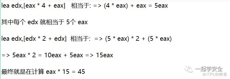 如果我们计算的乘法超出了该范围,则需要对乘法进行拆分,拆分时也应遵循2的次幂,拆分后在分开来计算,如下我们需要计算 15 * eax