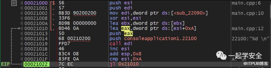 如下是反汇编后得到的结果,通常情况下加法指令是ADD运算才对,下方代码中并没有出现Add指令,我们的加法计算其实是转化为了lea eax, ds:[esi+0xA]