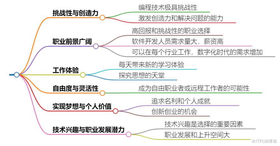 一、选择成为一名程序员的原因多种多样,主要可以从以下几个方面进行总结:1. 技术挑战和创造力的激发:编程技术是一项极具挑战性的工作,它能够激发个人的创造力和解决问题的能力。每当成功地解决了一个难题或者完成了一个项目,都会感到非常的满足和成就感。2. 职业前景广阔:随着世界变得越来越数字化,对具有技术背景的人才需求量大,尤其是在软件开发领域。根据美国劳工统计局的数据,未来十年,对软件开发人员的需求会很高。3. 高薪资水平:程序员的薪资水平普遍较高,这对于很多人来说是一个重要的吸引因素。高薪不仅能够满足基本的生活需求,还能帮助年轻人在城市里面立足。4. 工作自由度和灵活性:作为程序员,可以选择成为自由职业者或者远程工作者,这种自由度和灵活性使人们更加倾向于选择这个职业,能够更好地平衡工作和生活。5. 兴趣与职业发展:对于一些人来说,选择成为程序员是基于对编程的兴趣,也可能是看重程序员作为职业的前景和发展潜力。探讨选择成为程序员的动机,实质上是在探讨兴趣与职业发展之间的关系和取舍。6. 创新和创业的机会:程序员岗位更容易实现创新创业,这对于追求创新和个人品牌建设的人来说是一个巨大的吸引力。7. 技术兴趣和个人职业发展潜力:技术兴趣是程序员在选择职业路径时至关重要的考虑因素之一,同时个人的职业发展潜力也是重要的考量点。综上所述,选择成为一名程序员的原因包括但不限于对技术挑战的追求、职业前景的广阔、高薪资水平、工作的自由度和灵活性、基于兴趣的职业选择以及创新和创业的机会等。每个人的选择可能都有所不同,但这些因素共同构成了成为程序员的主要吸引力。