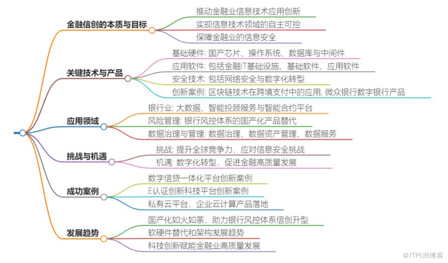 金融IT基础设施和基础软件的国产化:金融信创旨在推动金融业在信息技术应用创新方面的探索和实践,特别是在金融IT基础设施、基础软件等方面的技术和产品上实现自主可控,以保障金融业的信息安全。 区块链技术在跨境支付中的应用:区块链技术作为一种金融科技创新案例,被应用于跨境支付领域,以满足全球经济发展中日益增长的跨境支付需求。 基于国产芯片、操作系统、数据库与中间件等基础技术底座的金融应用开发:金融信创生态实验室牵头组织开展了多个基于这些基础技术底座的各类金融应用,进行适配、验证、调优和攻关。 大数据技术在银行业务中的应用:通过大数据技术,银行业能够精准定位个人客户与小微企业客户,降低营销成本,并通过智能投顾服务与智能合约平台提升服务效率。 数字银行的创新产品和服务:微众银行等金融机构将数字技术应用于金融领域,打造了具有突破性创新的产品和服务,推动了金融业数字化转型。 数据治理和数据资产管理:在数据治理、数据资产管理、数据服务以及更底层的元数据层面,金融客户需要国产化能力支撑,以帮助其在数据领域进行信创迁移。 银行风控体系的信创升级:随着国产信创产品的不断迭代发展,越来越多的银行开始选择用国产化产品替代原有的非国产化产品,以提升银行风控体系的安全性和可靠性。 高精度时间同步技术的应用:信创授时服务器为金融行业提供稳定、可靠的时间同步服务,对于各种业务的正常运行至关重要。 金融云解决方案的推进:致力于在金融信创领域持续推进产品落地,协助打造金融信创全栈云平台,深化在办公类系统的应用、金融机具应用、一般业务流程等方面的创新。