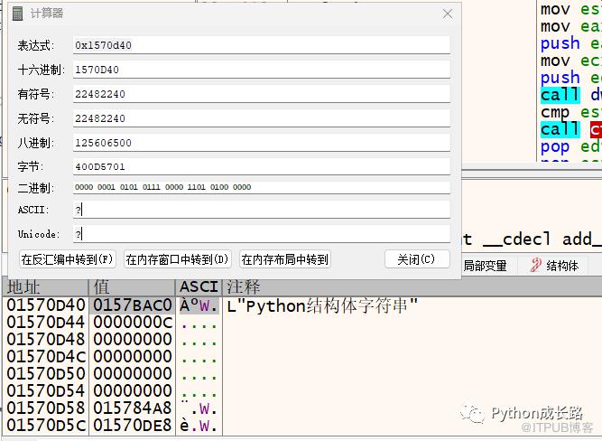 这个地址的内容就是Python构建出的结构体,如果不清楚结构体在内存中长啥样,可以把c代码创建的结构体也打印出来,然后在x32dbg中查看