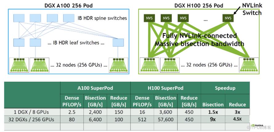 H100 GPU采用NVLink网络后,相比A100 GPU的IB网络速度提升了多少?以下是DGX A100 256 POD与DGX H100 256 POD的带宽对比: