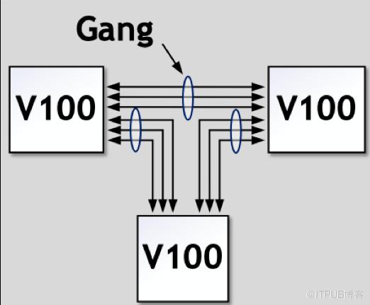 如上图所示,在没有NVSwitch的配置中,GPU之间的连接通常是通过将NVLinks聚合成多个组(Gang)来实现的。这意味着多个GPU通过共享的NVLink链路进行通信。