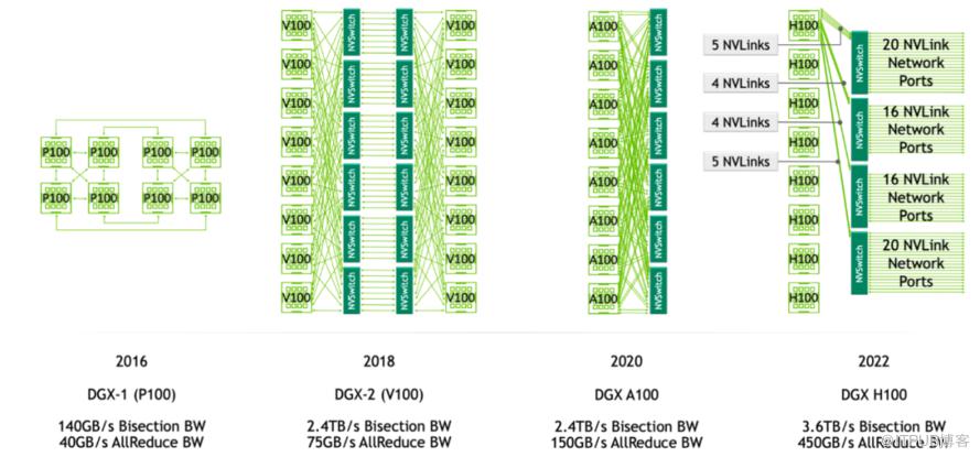 在NVIDIA的技术演进历程中,Pascal架构首次引入了NVLink,这一创新如同开辟了一条高速通道,极大地提升了GPU之间的通信效率。然而,真正的技术飞跃发生在下一代的Volta架构中,伴随着NVSwitch的诞生。
