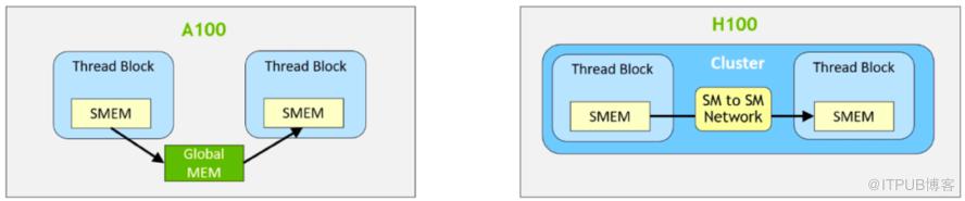 如上图所示,在H100之前的架构中,线程的控制相对有限,主要基于Grid和Block的划分,分别对应硬件SM和Device,且局部数据只能通过 shared memory 限制在SM内部,不能跨SM。然而,在Hopper架构中,情况发生了显著变化。通过在硬件层面引入交叉互联网络,数据得以在4个SM之间进行拓展和共享,GPC内SM可以高效访问彼此的共享内存。这一创新使得SM之间能够实现高效的通信,从而打破了之前架构中SM间的数据隔阂。